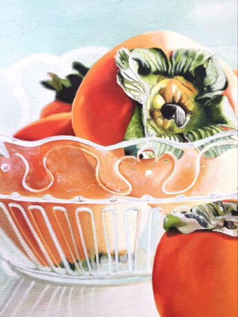 Persimmon Fruit Still Life Original Oil Painting – Fruit in Vintage Glass Bowl Art
