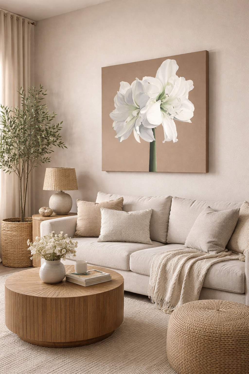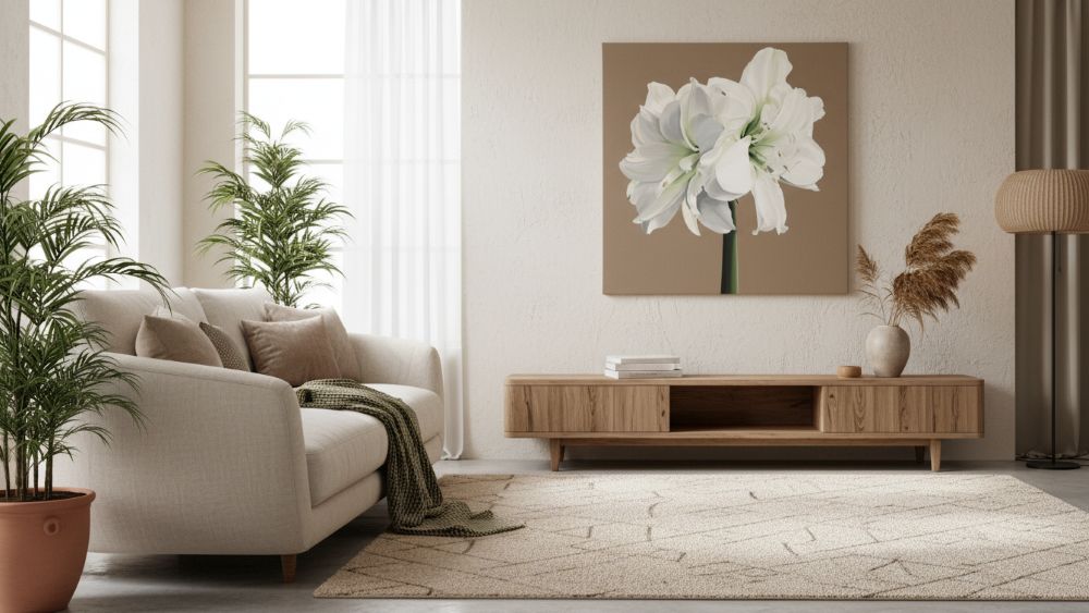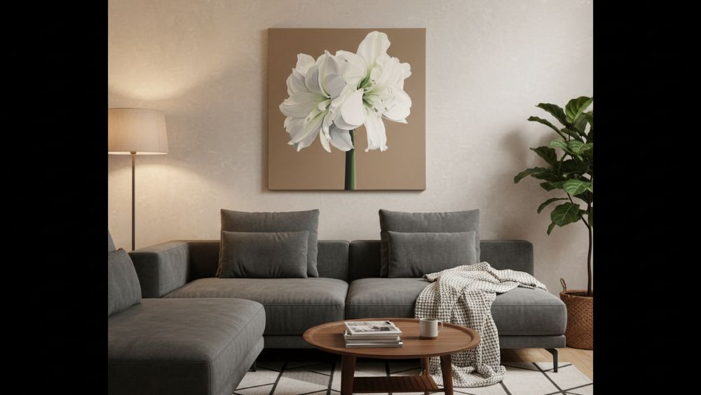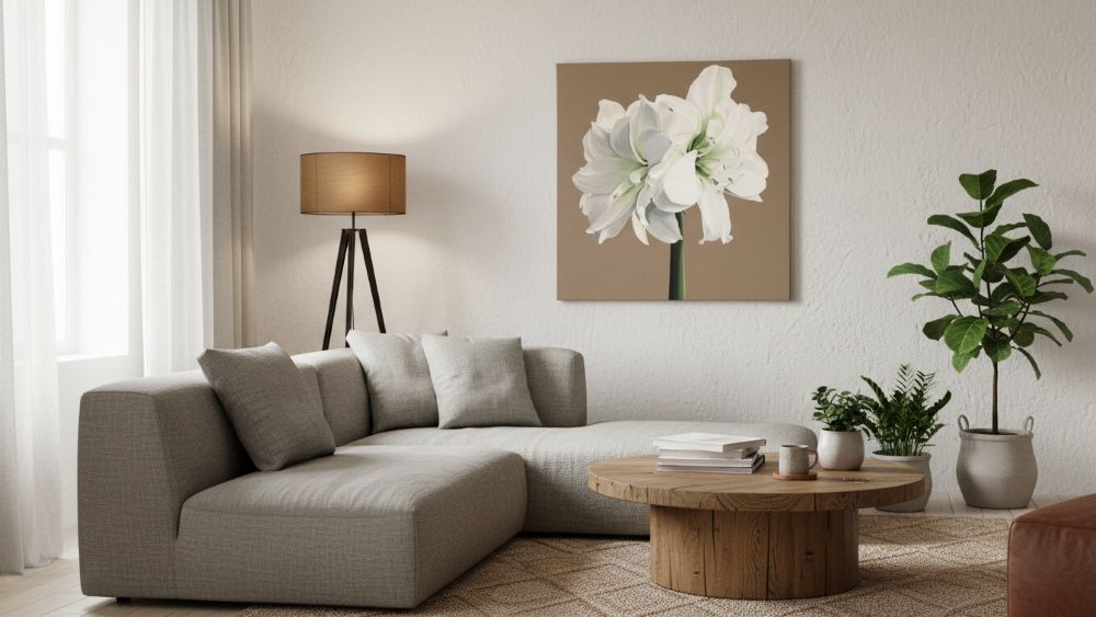 This piece would make a stunning focal point in contemporary or transitional interiors, particularly spaces with neutral palettes where the light brown background and clean white blooms would create a sophisticated display. The painting conveys both serenity and vitality, capturing the ephemeral beauty of the amaryllis at the peak of its bloom cycle.
