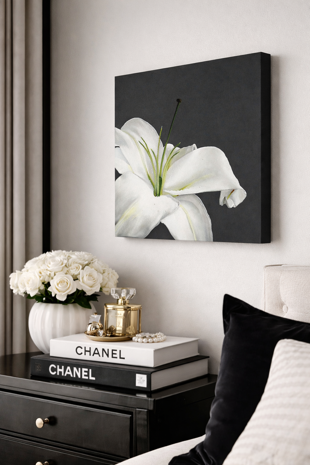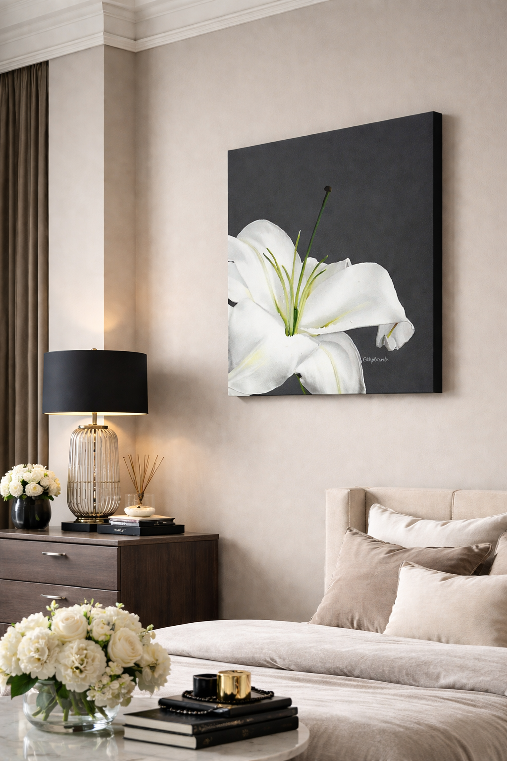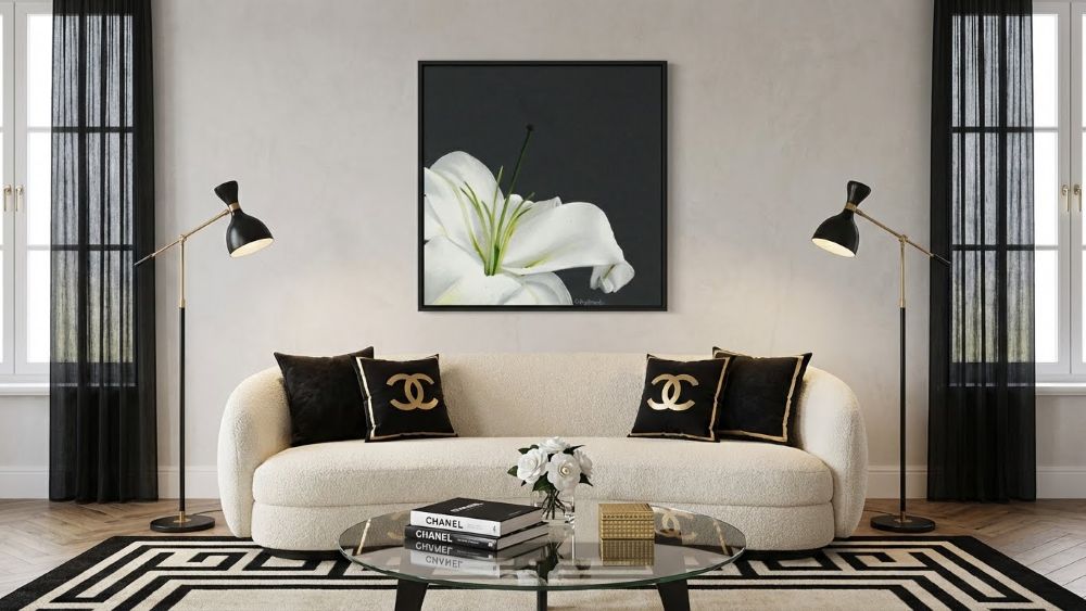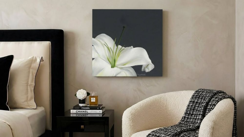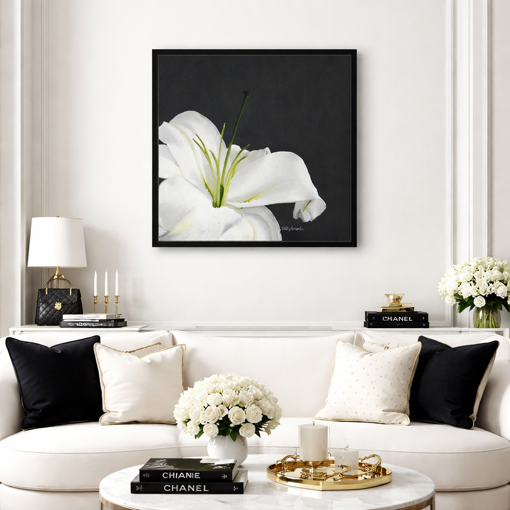 A white lily is a sign of purity and has long been a favorite flower of mine. This white stargazer lily painting shows a simple bloom on a dark gray background which really shows up the simple beauty of this flower. The macro botanical floral wall art is the perfect decor for a country home.