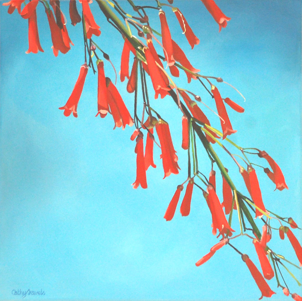 The gorgeous deep red of the flowers against the turquoise of the swimming pool was the ultimate in color co-ordination so it was important for me to get the colors just right. The delicate red bell flowers swayed gently in the warm African breeze, the swimming pool was very inviting but these had to be painted!