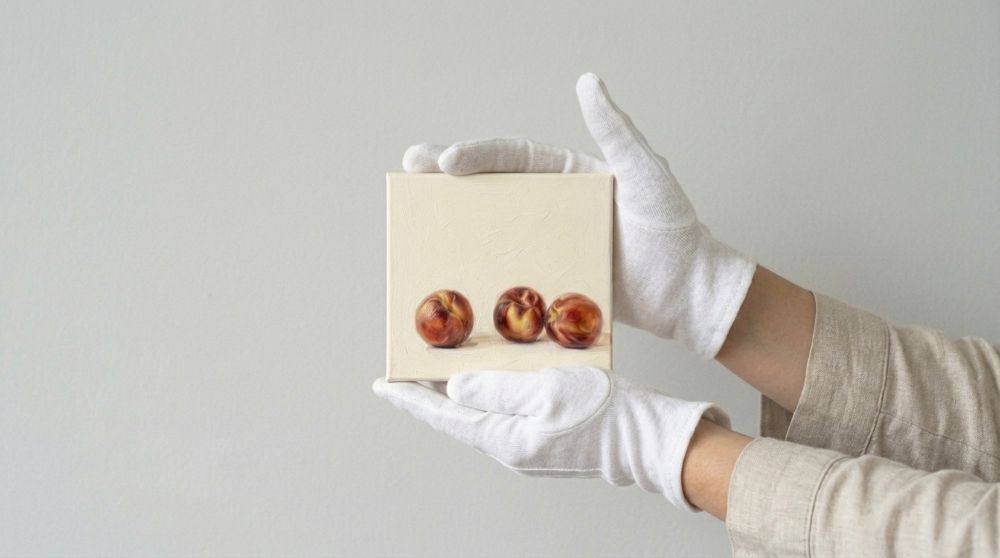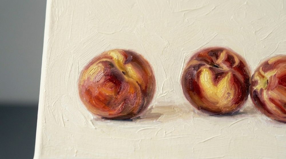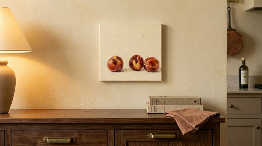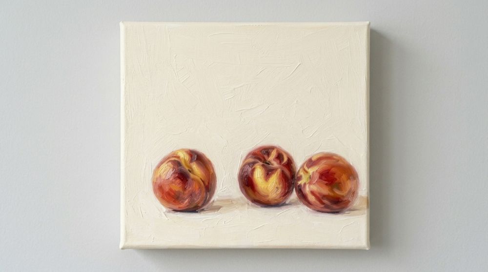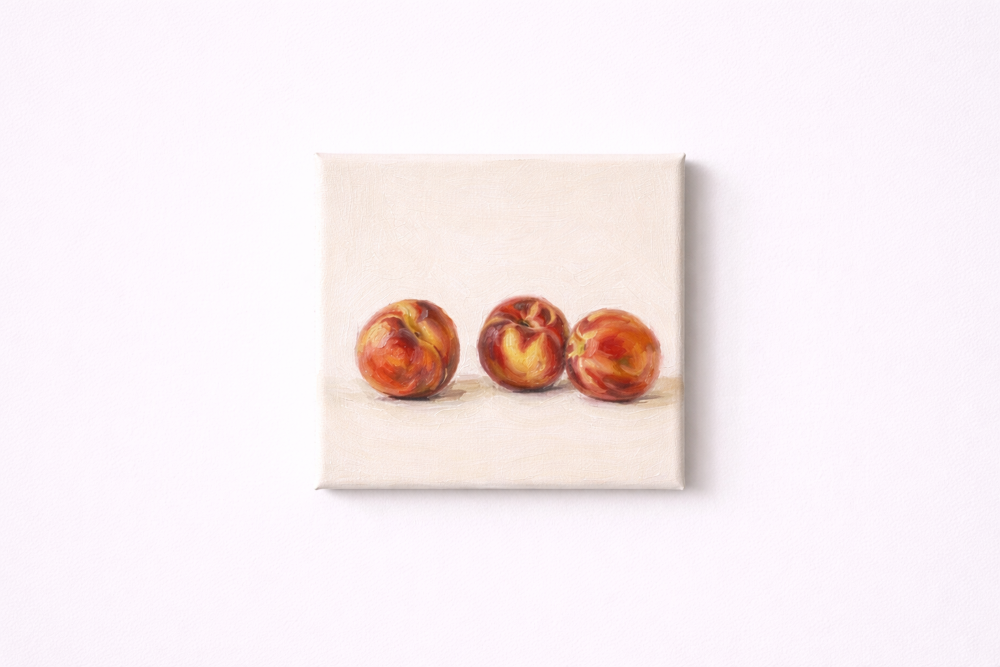 Part of my Botanical Studies series, this original peaches oil painting explores the quiet beauty of everyday forms. This still life painting features a 3 lovely peaches, rendered in oil on canvas with a restrained, minimalist approach. The composition is intentionally simple, allowing the subject to sit calmly within space and creating a sense of balance and stillness.