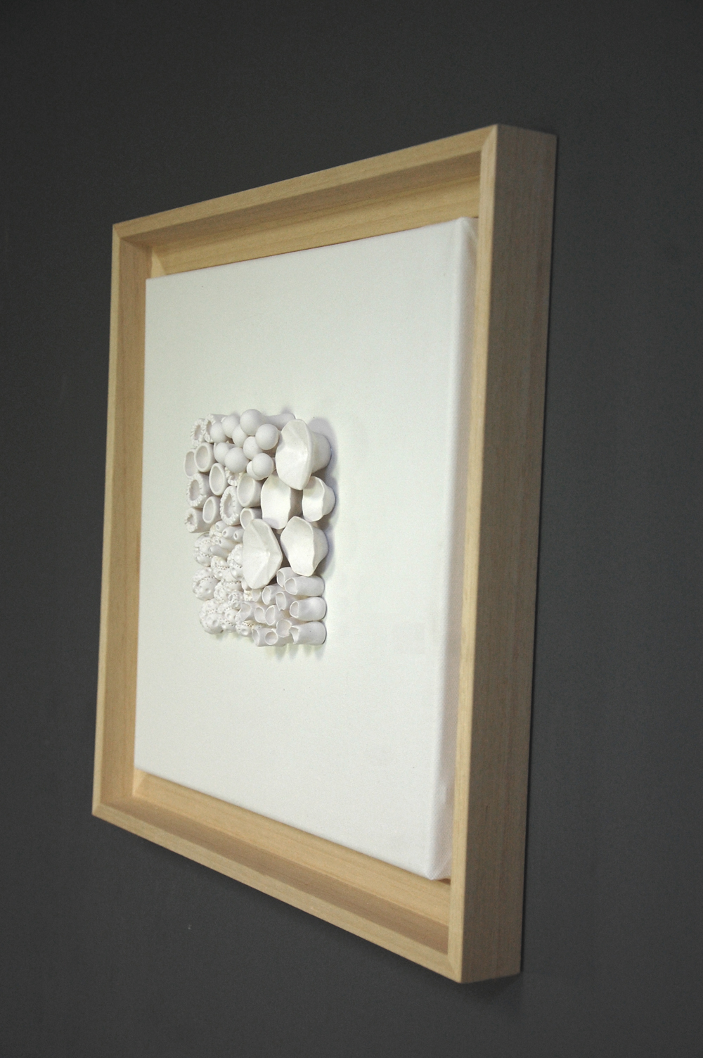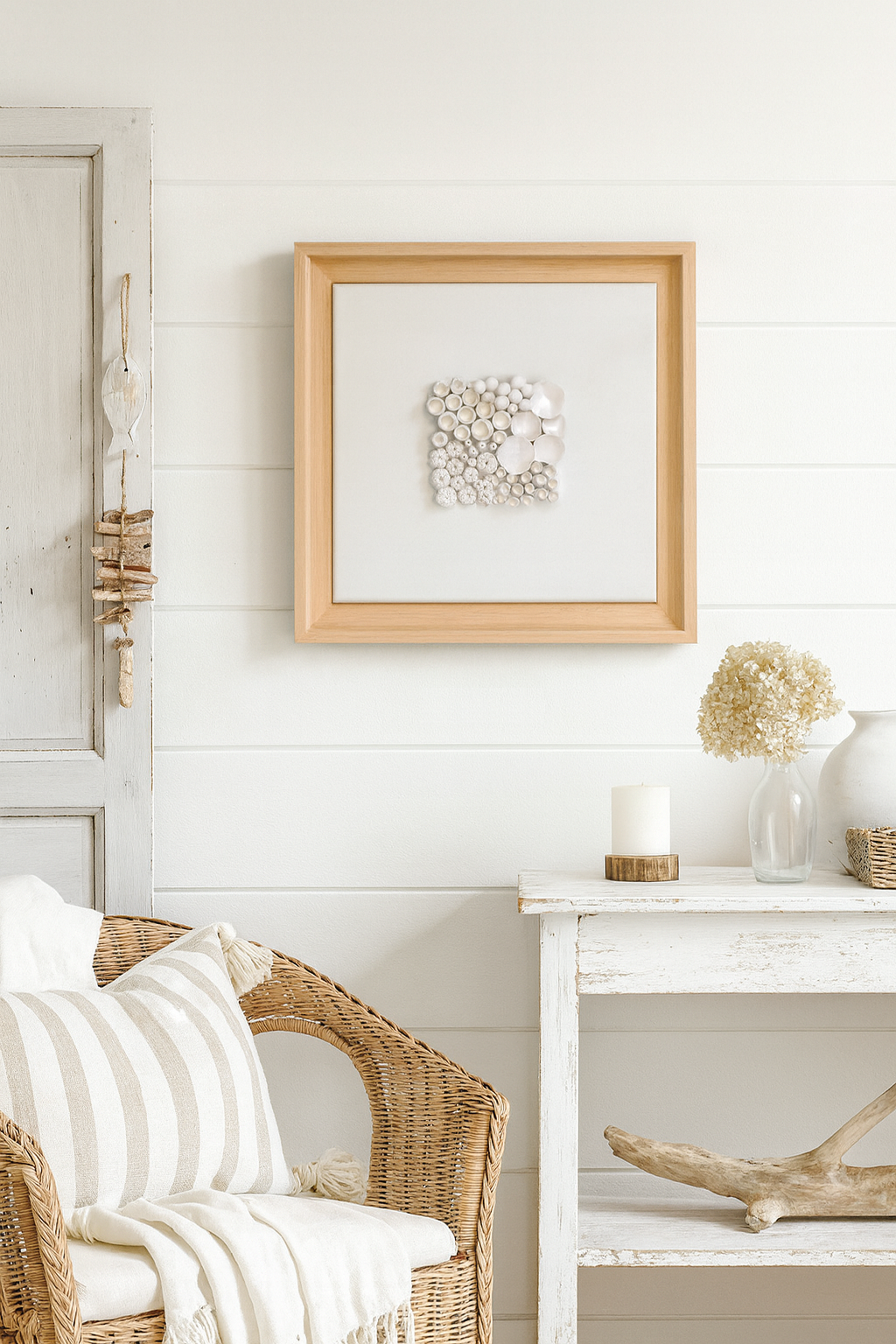Bring the serene beauty of the ocean floor into your home with this stunning, one-of-a-kind framed coral reef sculpture. This intricate piece features a captivating cluster of hand-sculpted clay elements, each inspired by the diverse and delicate forms of a living coral reef. From porous sea urchin-like orbs to smooth, open anemones and delicate petals, the variety of textures creates a tactile and visually engaging experience. The monochromatic white finish lends a clean, minimalist aesthetic, allowing the beauty of the forms and shadows to take center stage.