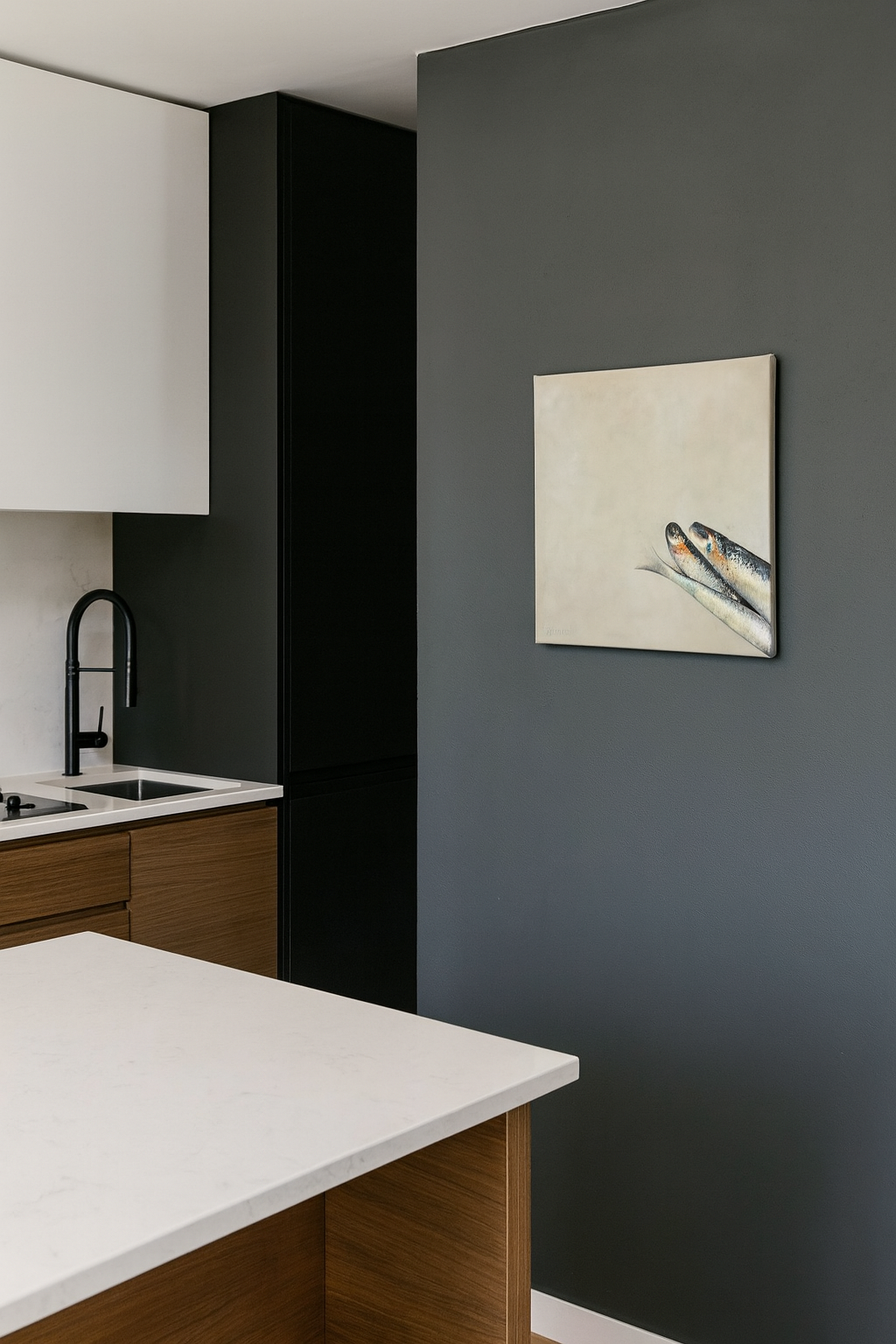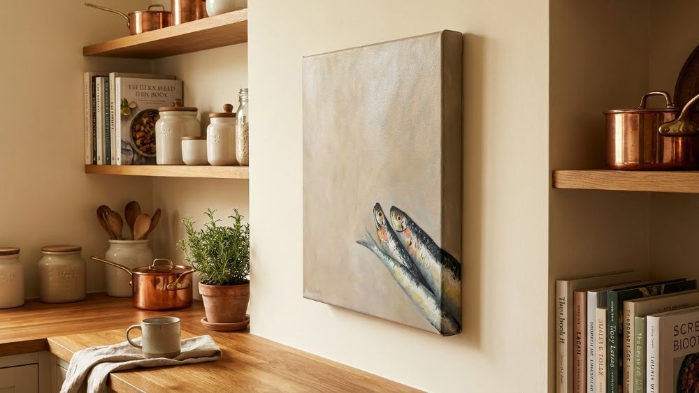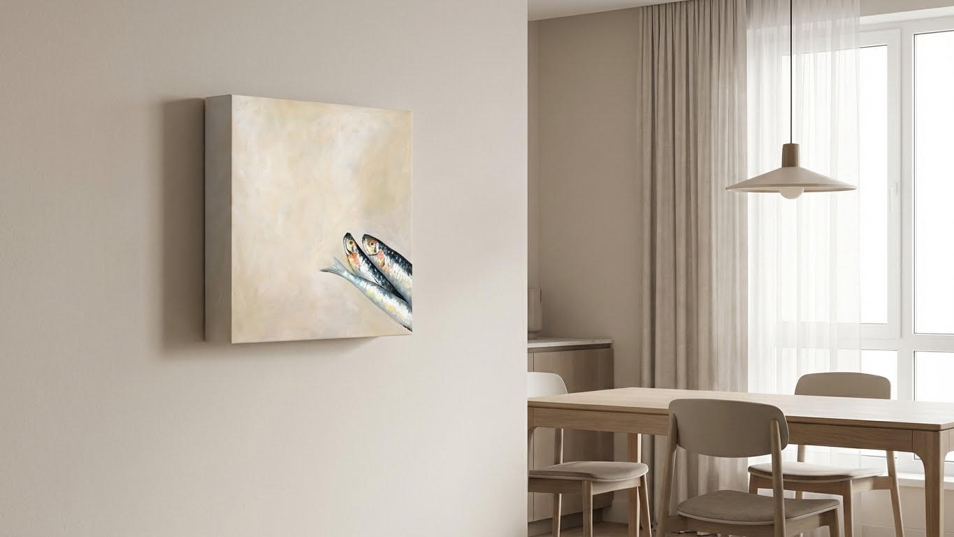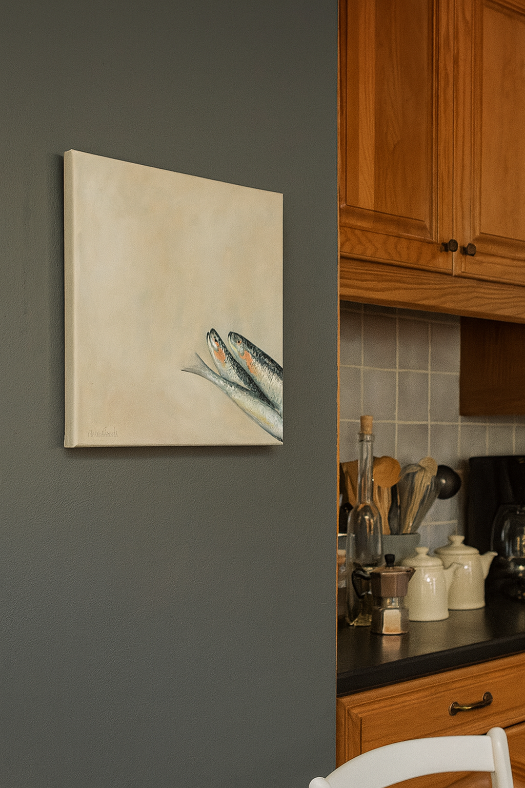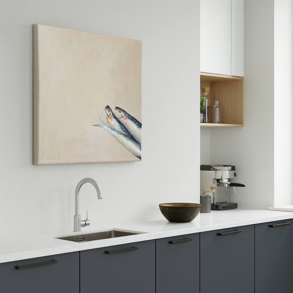 Perfect for bringing personality to your kitchen, dining area, or breakfast nook, this painting features three detailed and personality-filled sardines huddled together. Their shimmering scales, painted with vibrant hints of blue and orange, pop against the minimalist, neutral background, creating a piece that is both modern and playful. It’s the perfect conversation starter and a unique piece of art for any seafood lover, foodie, or fan of coastal living.
