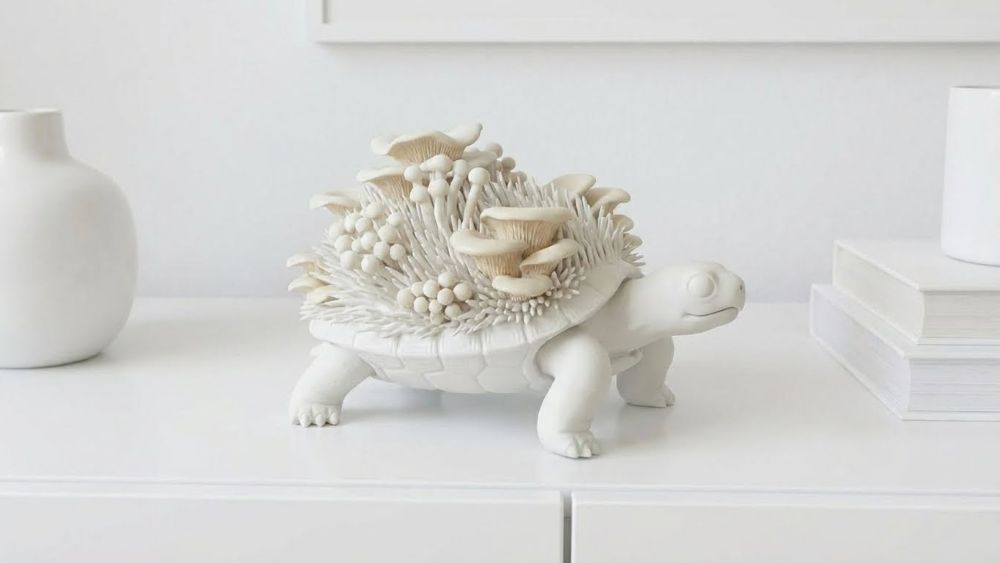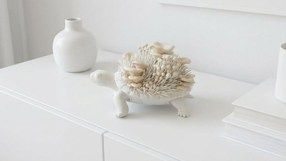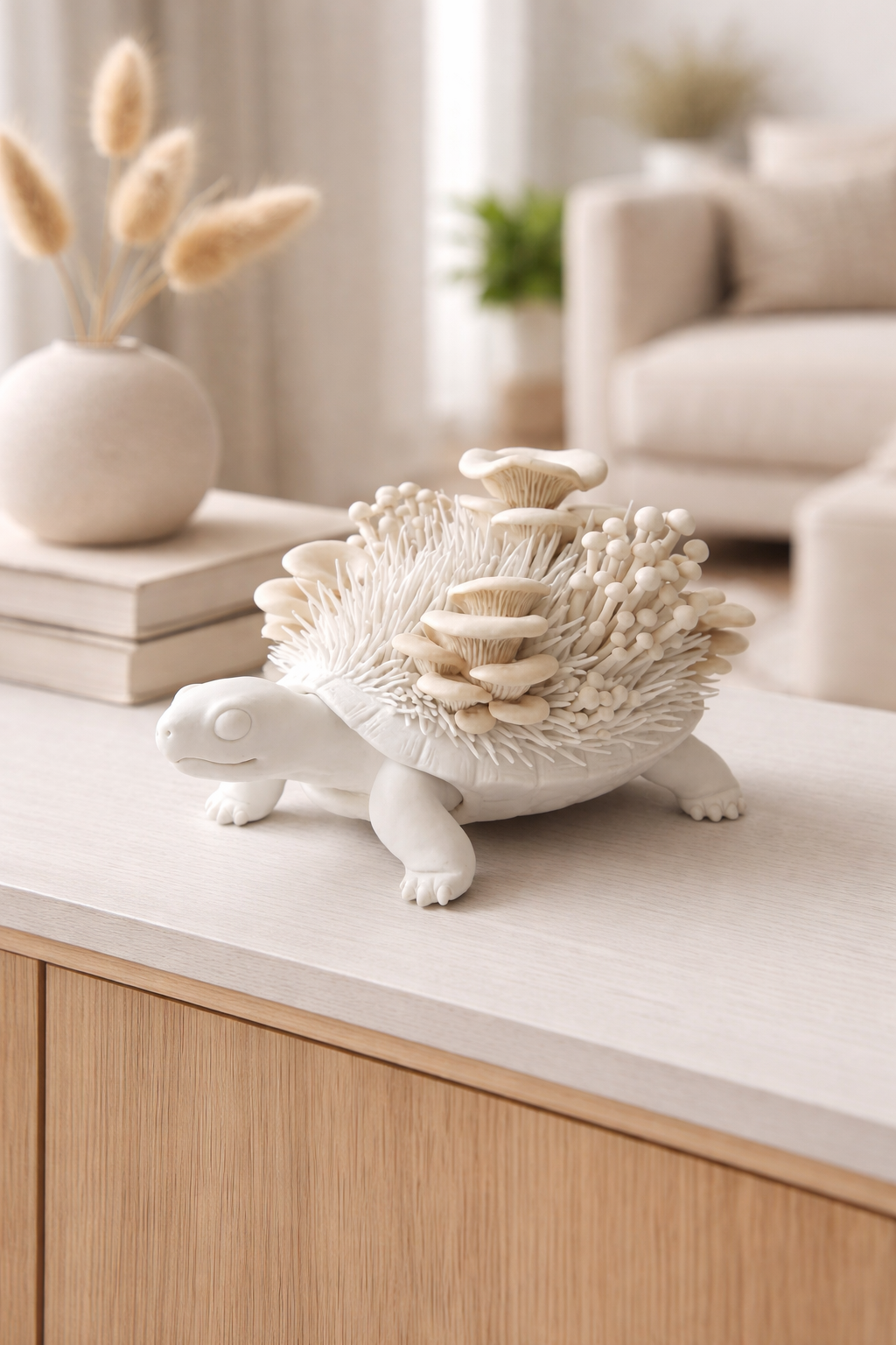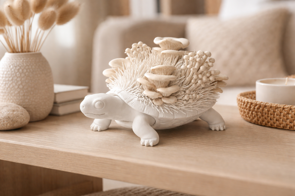 Bring a touch of enchanted woodland magic into your space with this Tortoise & Mushroom Sculpture, a truly unique piece of whimsical nature art. This handcrafted tortoise features a serene, minimalist body adorned with an intricate shell of organic oyster and enoki mushrooms and grass-like textures, blending fantasy, cottagecore, and modern sculptural design.