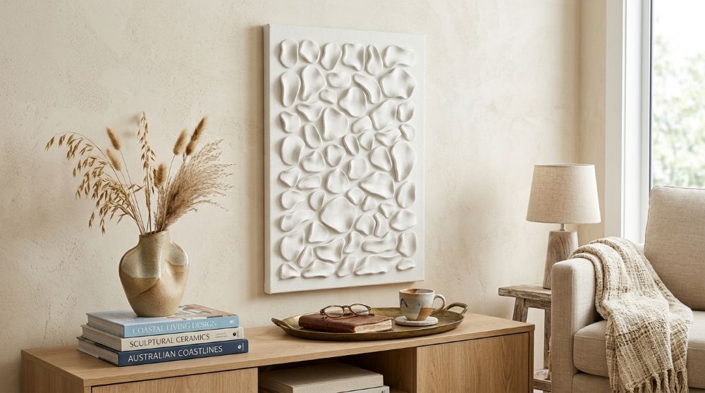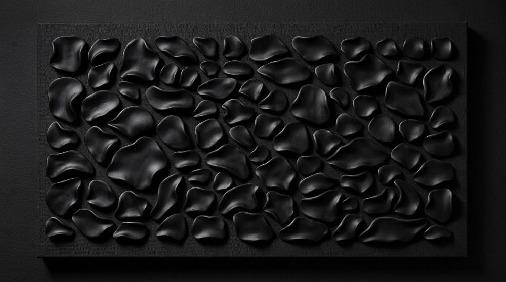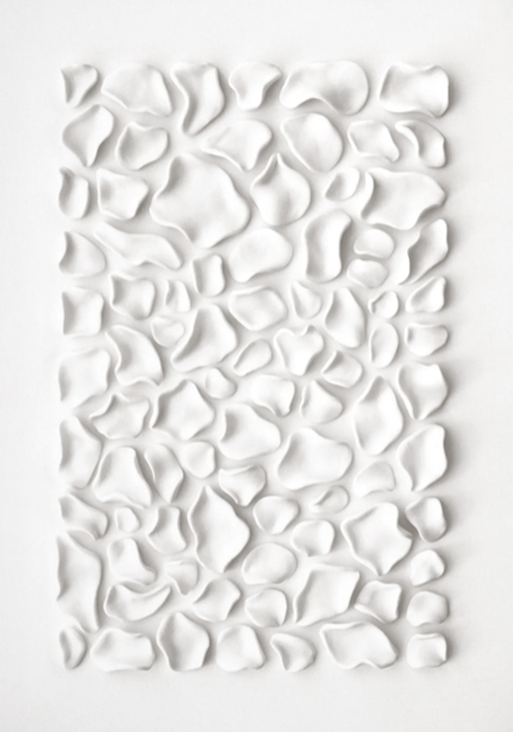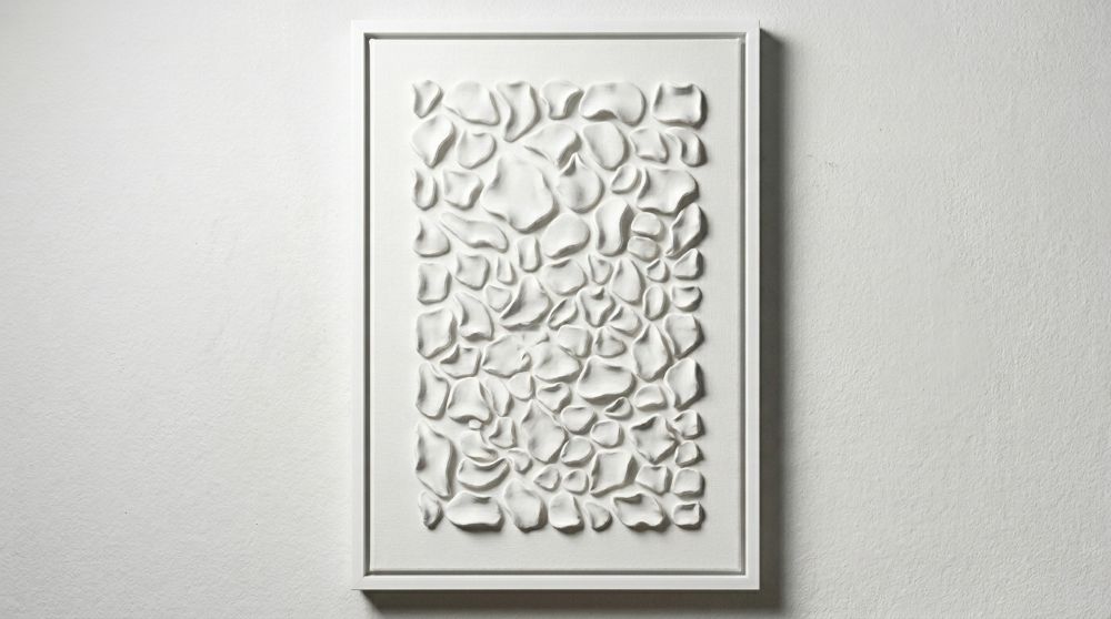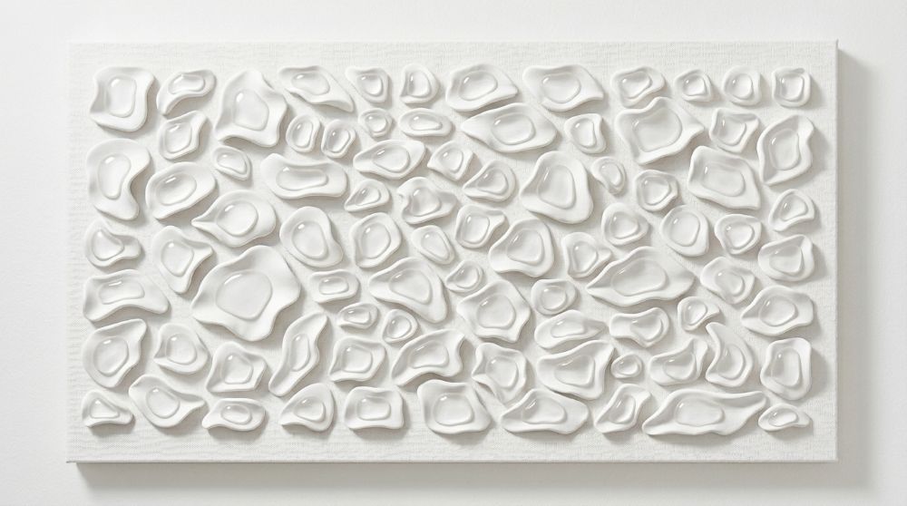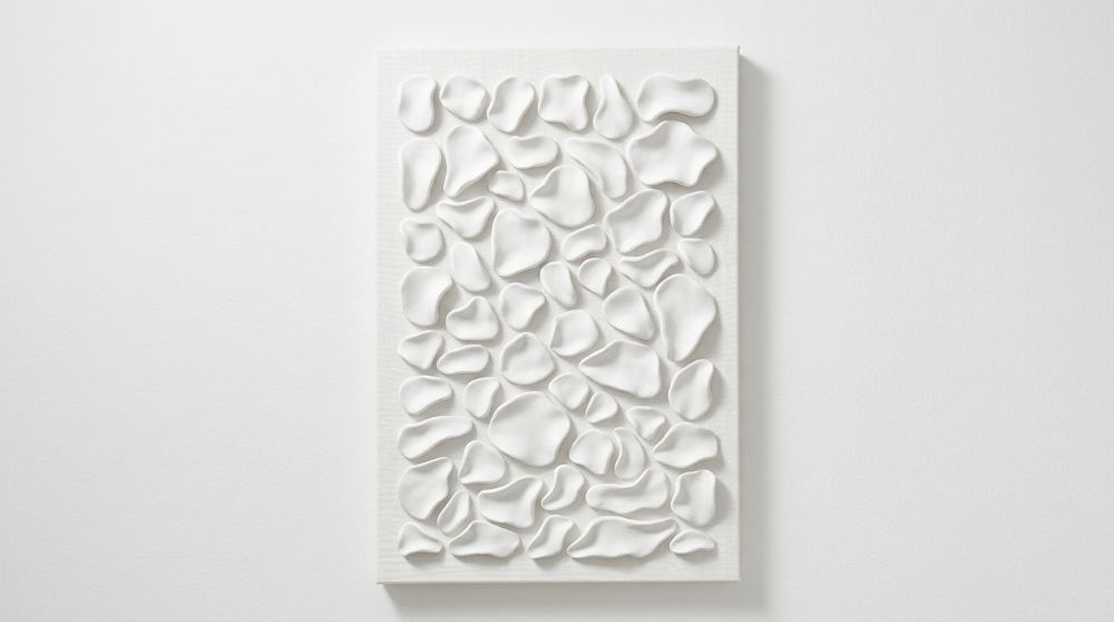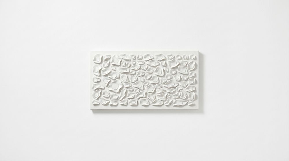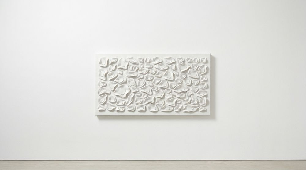 Luxury hand-sculpted textured wall panel in satin white. A refined statement piece designed for calm, elevated, high-end interiors. This contemporary sculptural artwork explores softness, rhythm, and organic form through a series of individually shaped elements arranged across the surface. The composition creates a subtle interplay of light and shadow, offering a quiet sense of movement that evolves throughout the day.