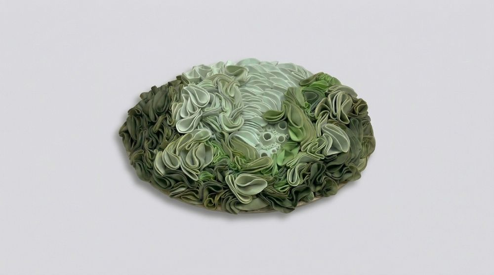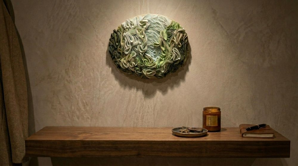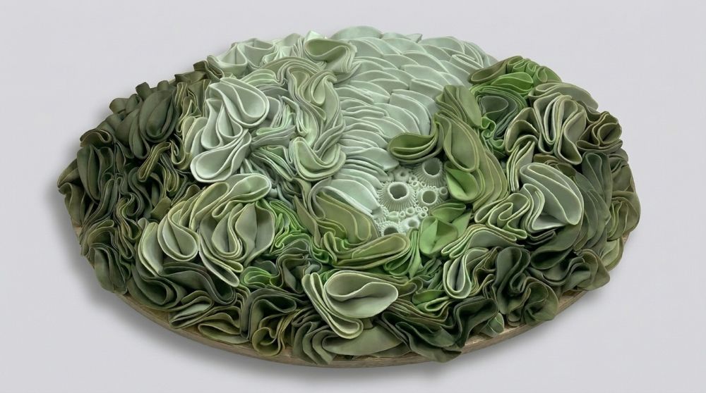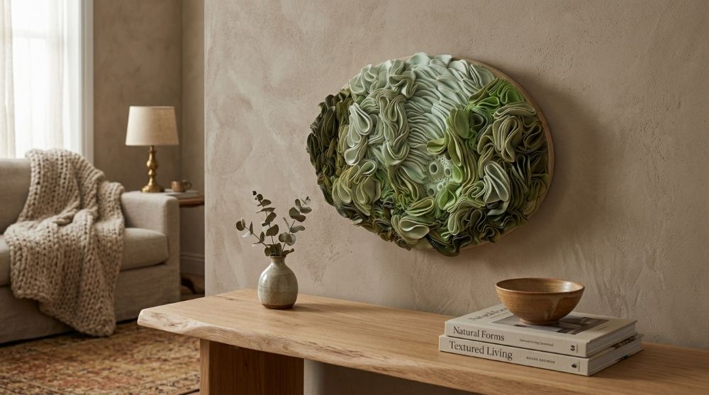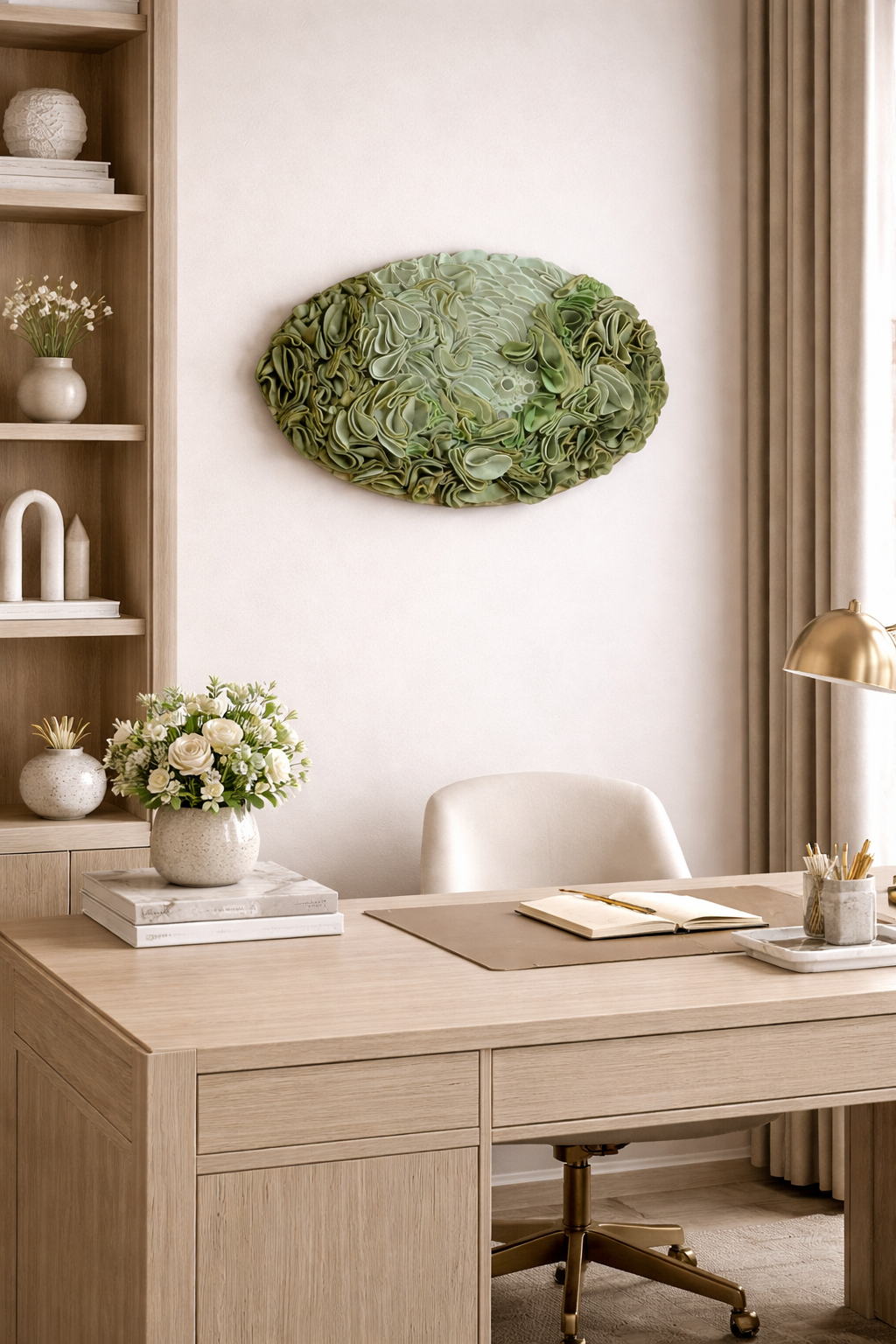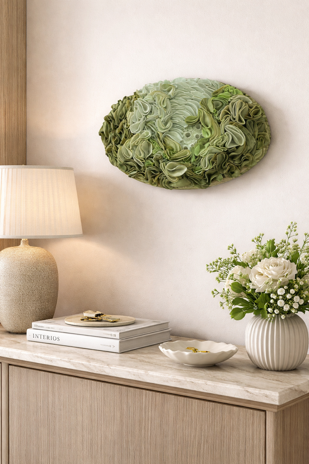 Soft gradients of green create a calming, earthy palette, while the sculptural surface captures light and shadow in a way that brings the piece to life from every angle. The composition feels both modern and timeless, making it a sophisticated focal point for curated interiors.