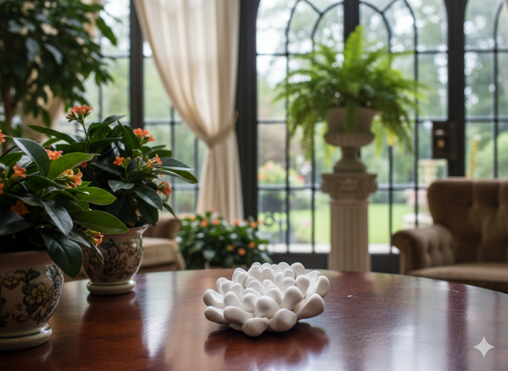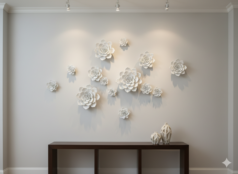 The white sculpture was meticulously sculpted in clay and can be hung from a small nail since it is not very heavy.